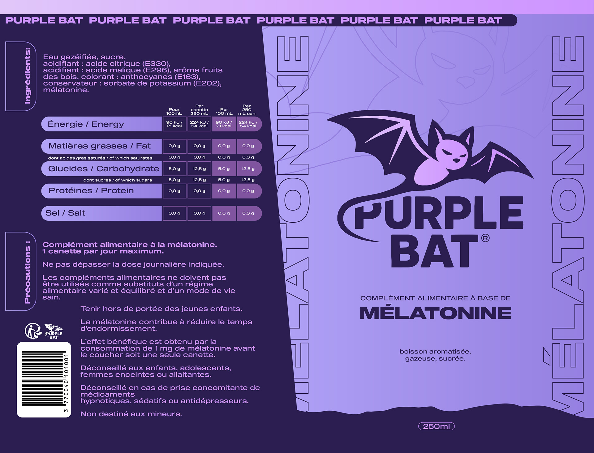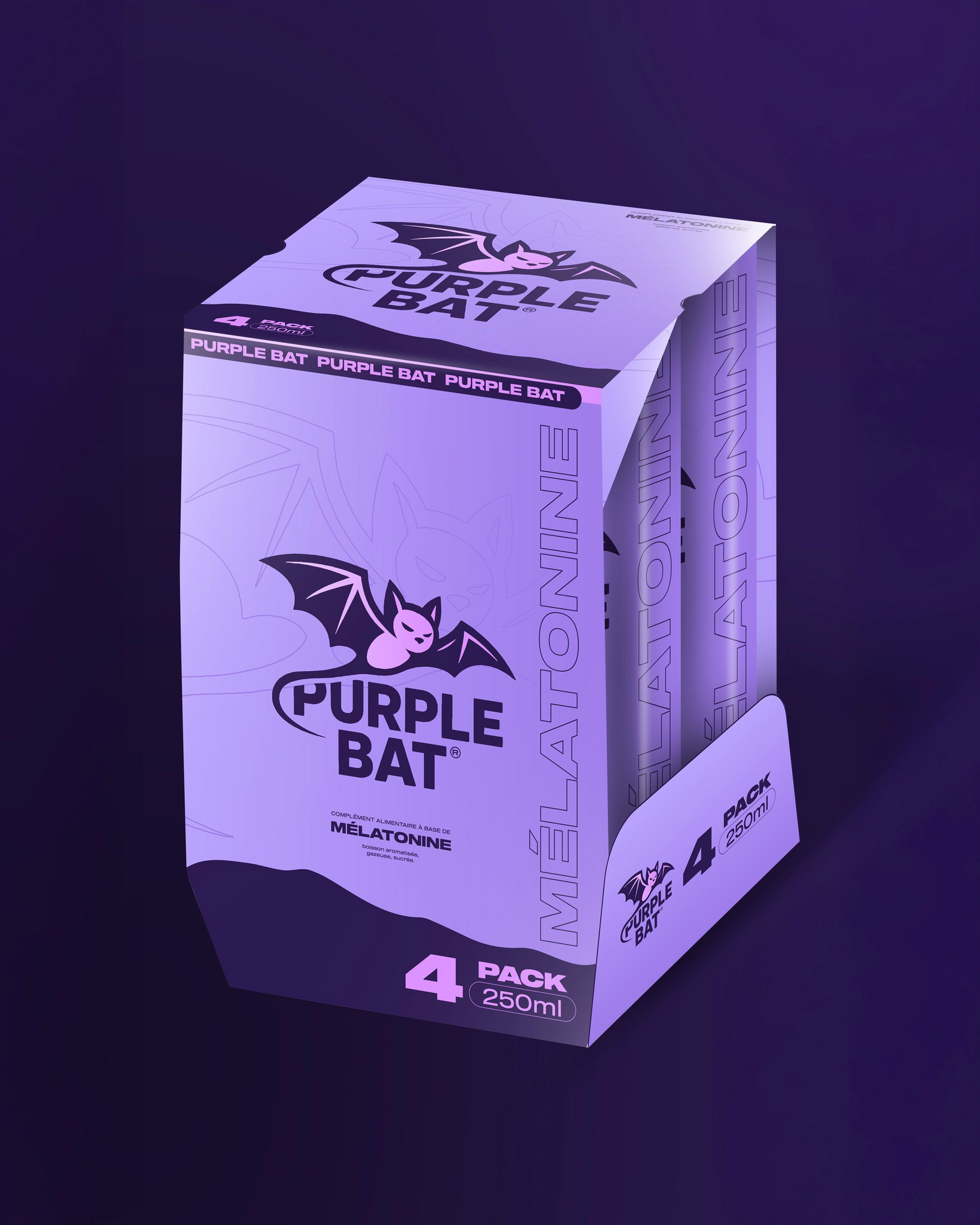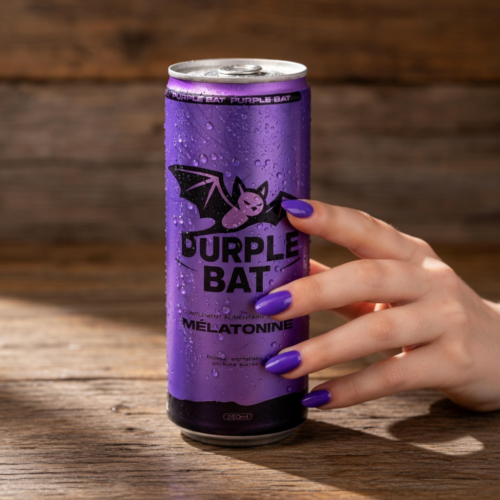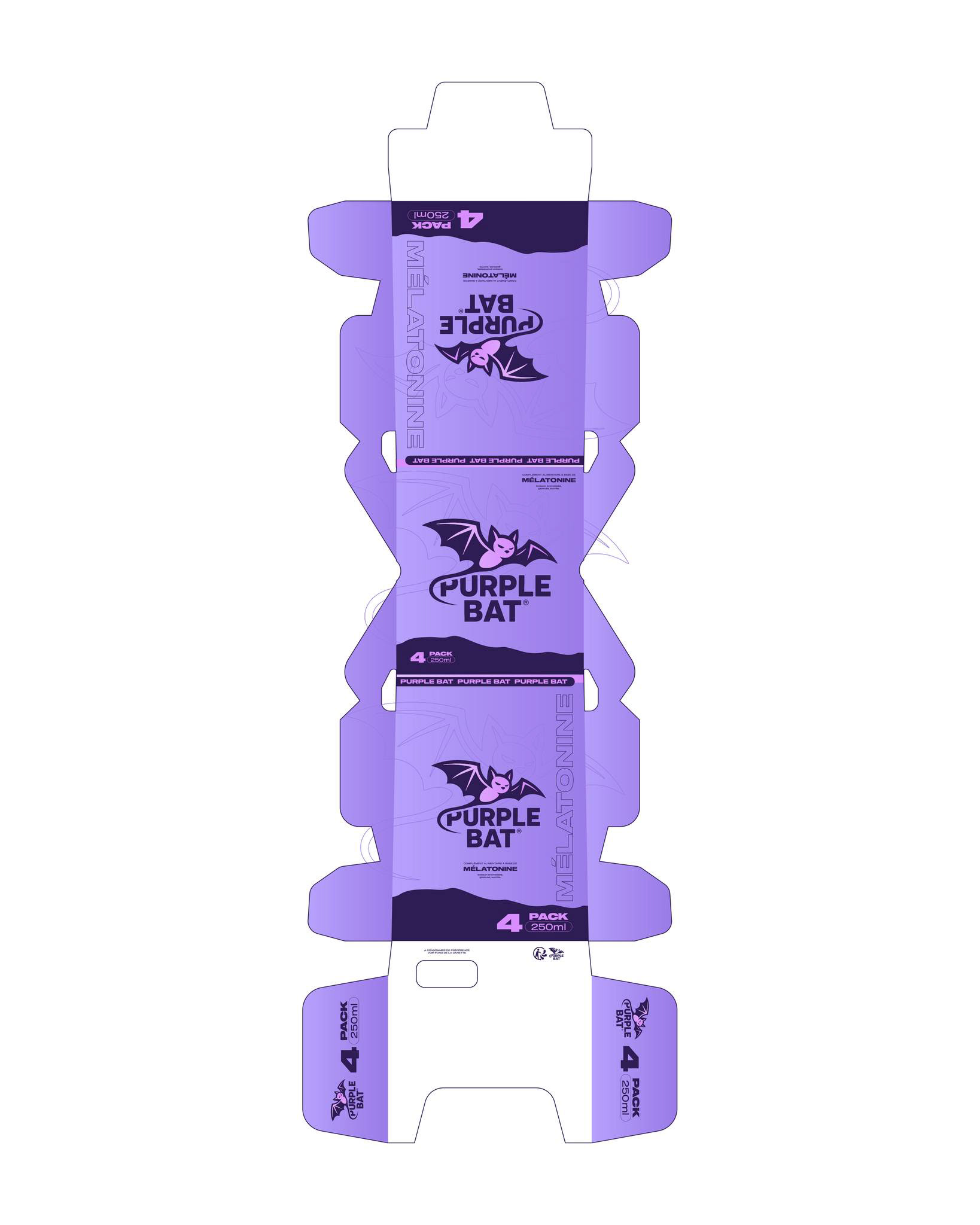 Conception du branding global et du packaging pour la marque de boisson à la mélatonine Purple Bat, alliant identité visuelle forte et expérience produit cohérente.